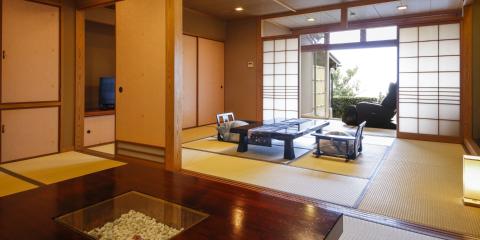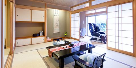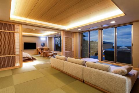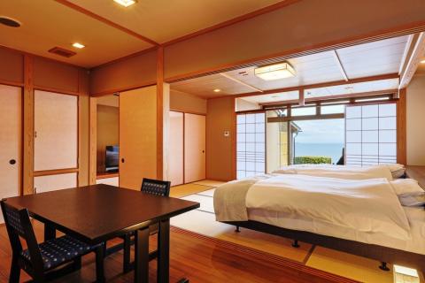 オーシャンビューの琉球畳敷きの客室には、シモンズ社製のベッドを採用し、壮麗な日本海一望の展望デッキ、マッサージチェア、そして、お食事専用のお部屋を隣接。